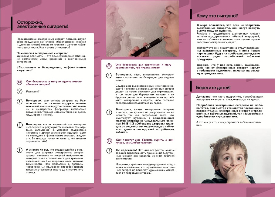 На данный момент электронных сигарет как-бы нет в природе: они не имеют точного названия, описания, экспертизы, норм состава и продаж. Поэтому их под разными названиями (паровой коктейль, индивидуальный испаритель, вейп, вепоразер, е-сига, егошка, яга) можно купить практически в любом месте – от ларька до интернета. Причём сделать это может кто угодно, даже дети любого возраста. Польстившись на красивое название, например, «паровой коктейль со вкусом колы», он ведь не будет изучать состав картриджа этого изделия… А там!!!...