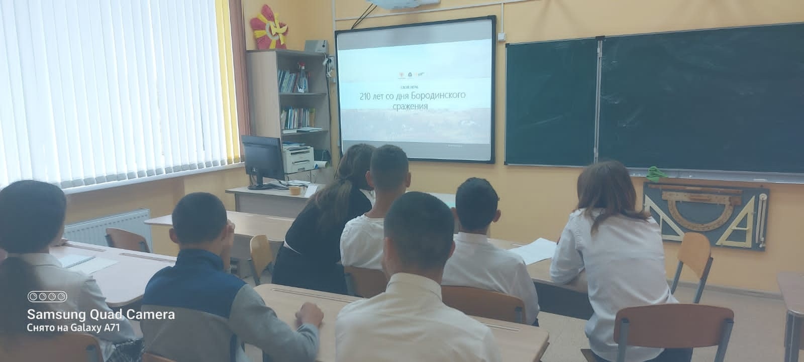 7 сентября в МОБУ СОШ имени Героя Советского Союза Ракшина Д.С. прошли мероприятия, посвященные 210-летию со Дня Бородинского сражения. Ребята узнали много интересных исторических фактов о битве у с. Бородино. Вспомнили произведения великих поэтов об этом историческом событии. Затем школьники приняли участие в акции "Читаем вместе с советником". Учащиеся 1- 9 классов читали произведение М.Ю. Лермонтова "Бородино". Вместе с советником Сигута Д.Л. учащиеся 9 класса провели интеллектуальную игру"210 лет со дня Бородинского сражения" в ходе которой старшеклассники в интерактивном формате разобрали историю битвы с Наполеоном.